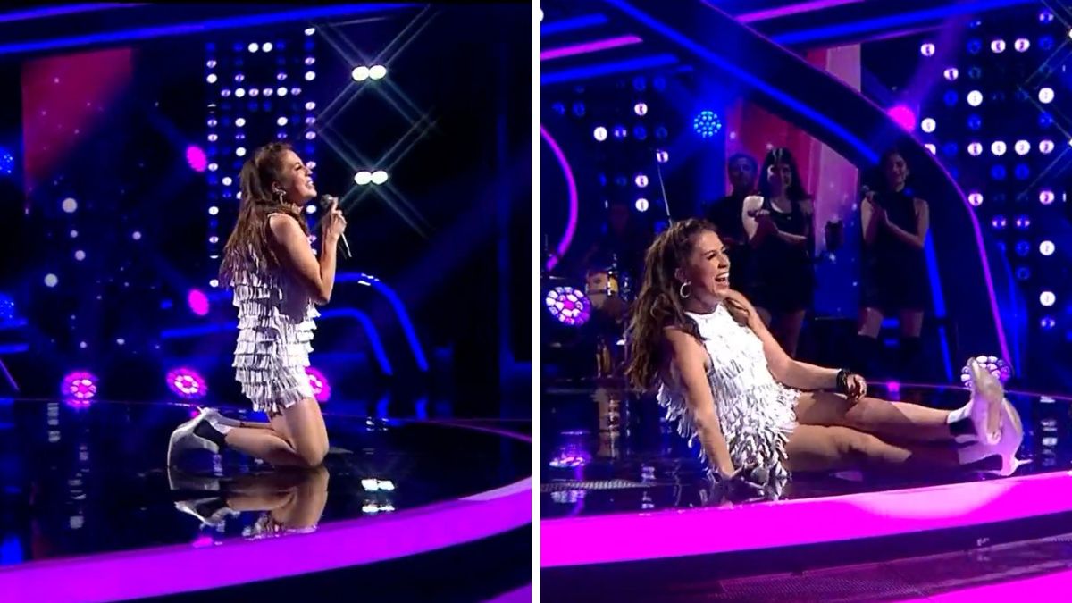 Cabe aclarar que si bien la imitadora se salvó de una terrible caída, ya cuando estaba por terminar la canción, se tiró al suelo riéndose de lo que había sucedido.