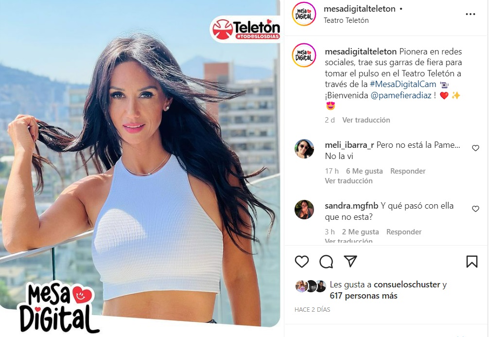 "Pionera en redes sociales. Trae sus garras de fiera para tomar el pulso en el Teatro Teletón a través de la #MesaDigitalCam 📹 ¡Bienvenida @pamefieradiaz !", había publicado el Instagram de Mesa Digital Teletón hace dos días.