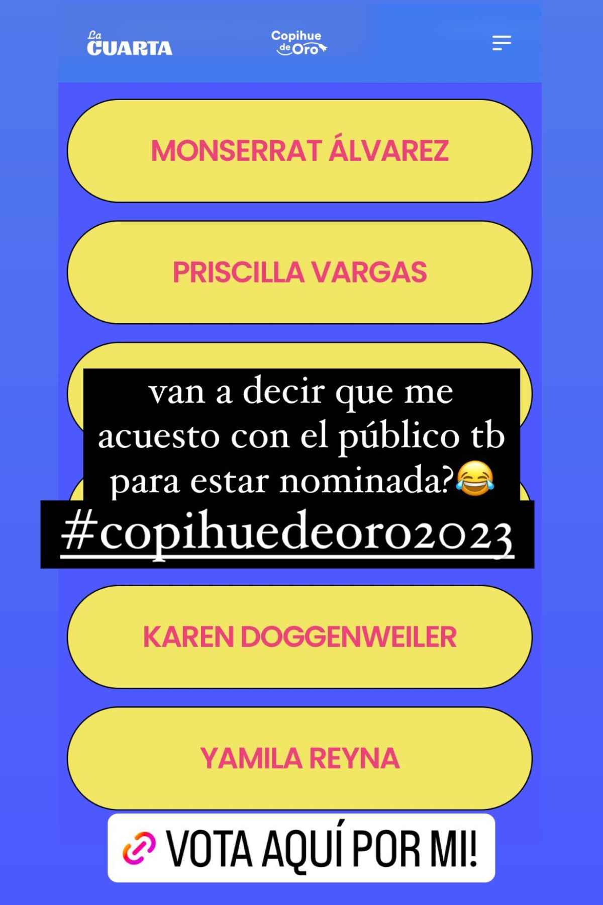 Luego invitó a sus seguidores de Instagram a votar por ella. "Nominada a Mejor Animadora 2023. Copihue de Oro y al lado de estas genias! Gracias", comentó, destacando a las otras nominadas que son Priscilla Vargas, Monserrat Álvarez, Millaray Viera, Karen Doggenweiler y María Luisa Godoy.