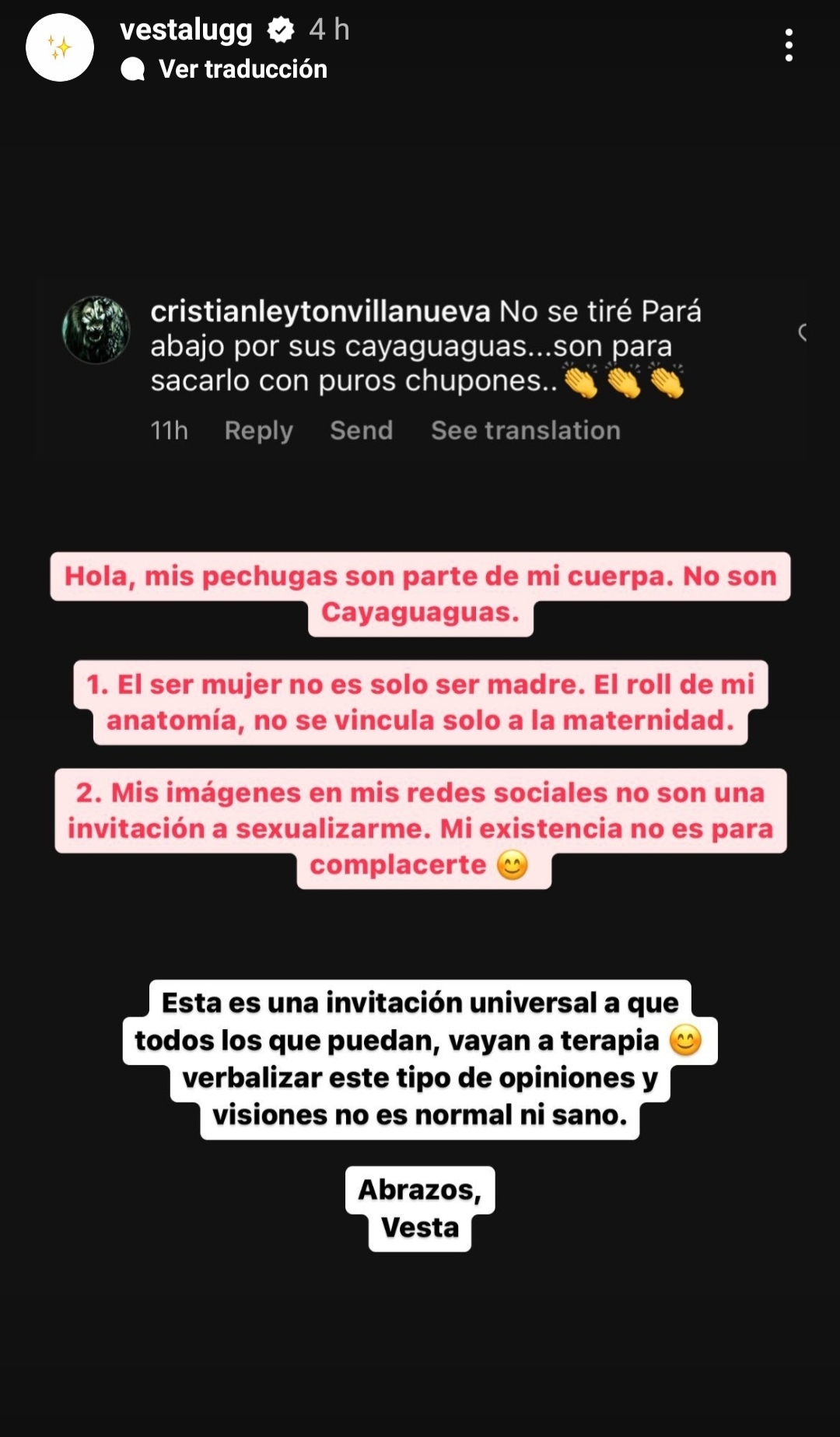 Pero Vesta Lugg no lo dejó pasar, sino que, muy por el contrario, expuso a esa persona en las historias en su cuenta de Instagram.