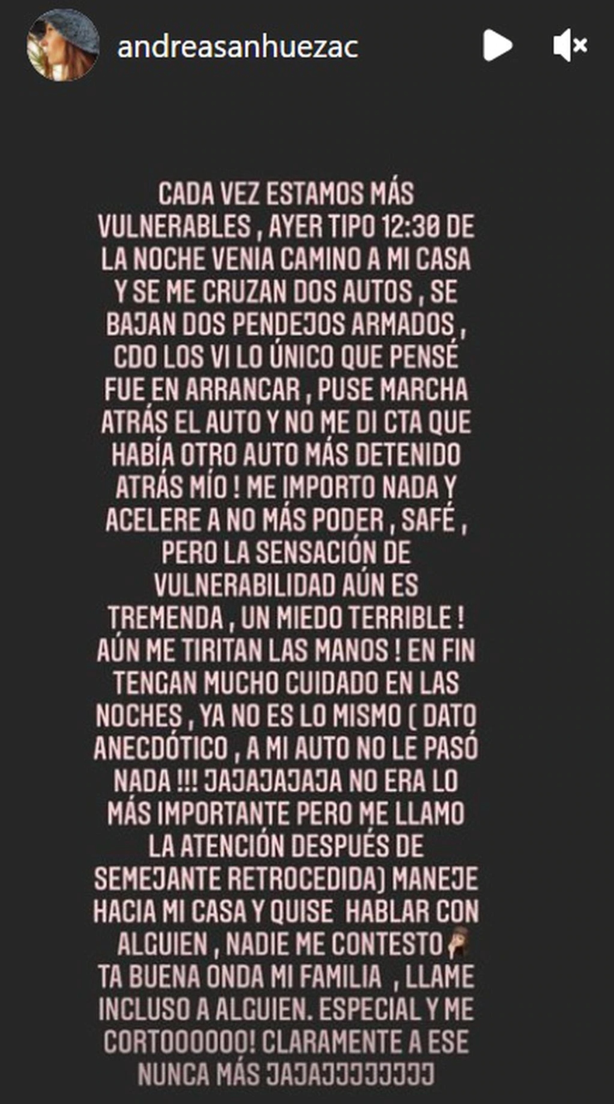"Cada vez estamos más vulnerables. Ayer tipo 12:30 de la noche venía camino a mi casa y se me cruzan dos autos, se bajan dos pendejos armados. Cuando los vi, lo único que pensé fue en arrancar", partió diciendo Andrea Sanhueza en sus historias de Instagram.