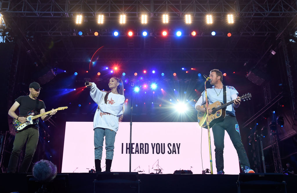 La banda británica Coldplay fue una de las últimas en subirse al escenario y comenzaron su presentación con un clásico de Oasis, "Don't look back in anger", donde se sumó Ariana Grande.