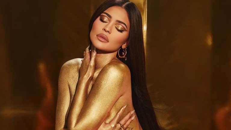 Para celebrar el lanzamiento de su nueva colección de cosmética y maquillaje, a la par de su cumpleaños, Kylie Jenner posó en una increíble sesión fotográfica. Allí, también usó un bikini dorado y un impactante body paint con las mismas tonalidades.