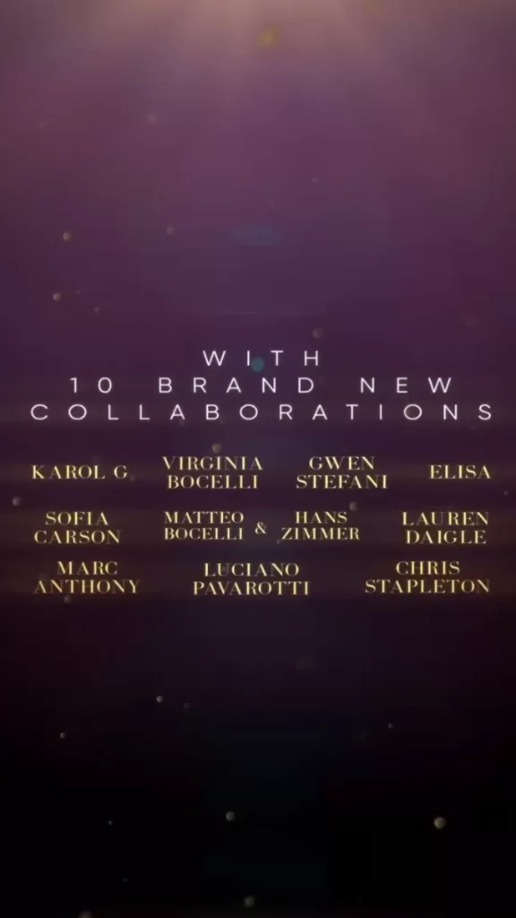 Lamentablemente, lo único que tenemos por ahora es el video que el tenor italiano subió a su cuenta de X, donde reveló que el disco contará con 10 interesantes colaboraciones, entre las que se destaca La Bichota. Entre el listado también destacan importantes artistas de talla internacional, como Ed Sheeran, Marc Anthony, Gwen Stefani y Dua Lipa.