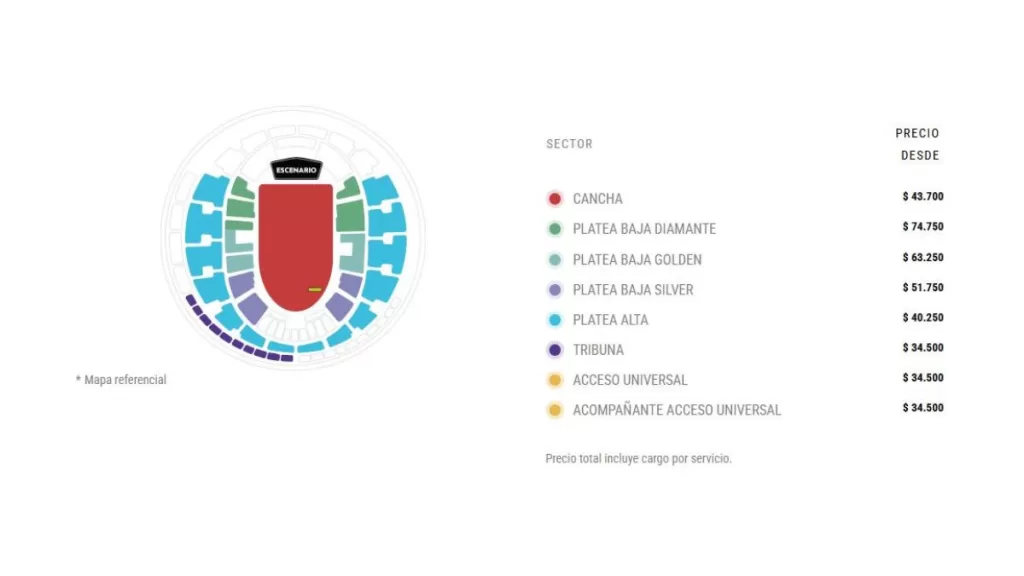 Platea Baja Golden a $63.250, Platea Baja Diamante $74.750 y Cancha a $43.700. Se desconoce si los tickets serán numerados, el concierto es a recinto completo y la cancha no tendrá división.