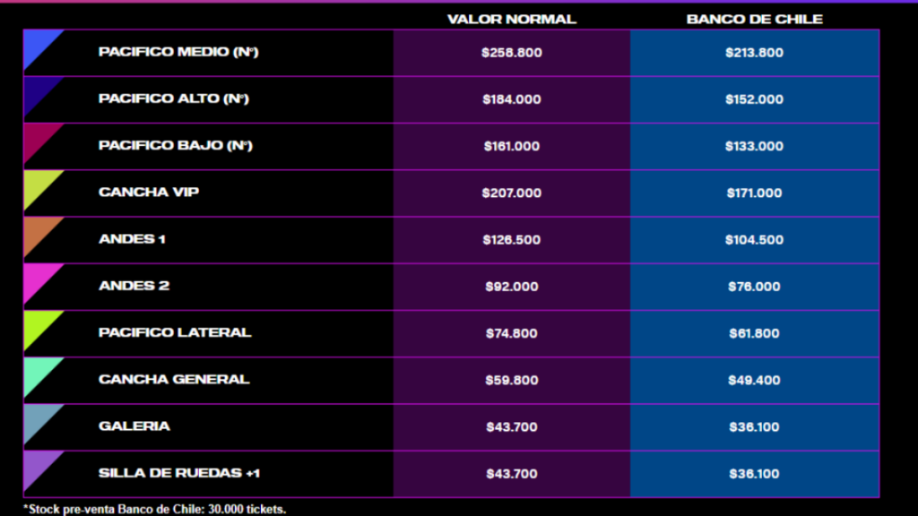 Las entradas normales para el concierto van desde los $40.000 a los $260.000 en la zona más cercana al escenario.