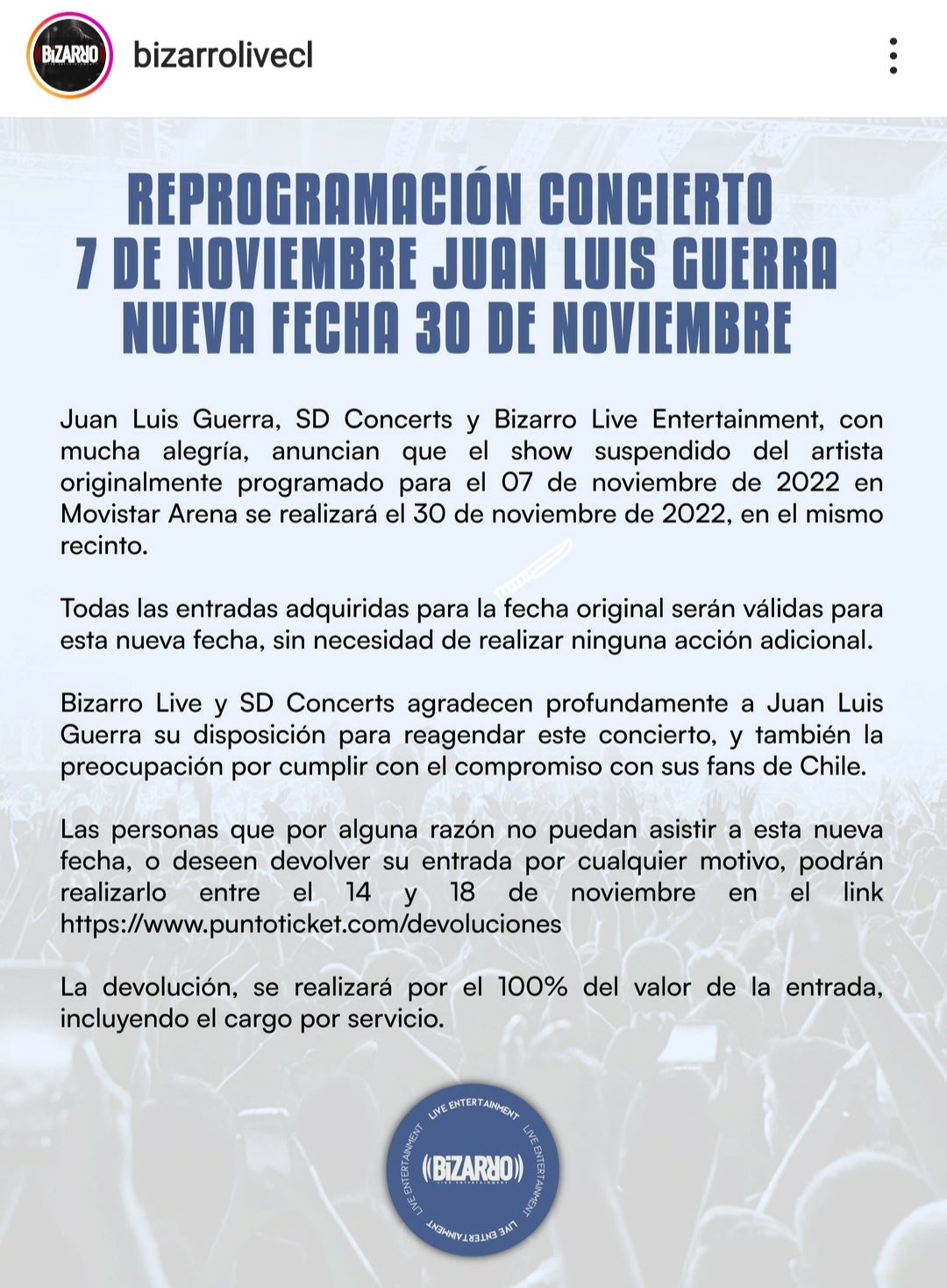"Todas las entradas adquiridas para la fecha original serán válidas para esta nueva fecha, sin necesidad de realizar ninguna acción adicional. Bizarro Live y SD Concerts agradecen profundamente a Juan Luis Guerra su disposición para reagendar este concierto, y también la preocupación por cumplir con el compromiso con sus fans de Chile".