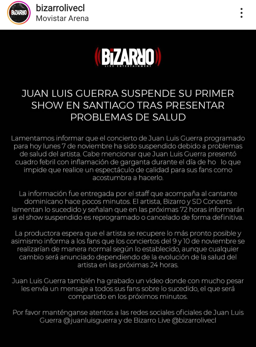 "Juan Luis Guerra también grabó un video donde, con mucho pesar, les envía un mensaje a todos sus fans sobre lo sucedido. Video que será compartido en los próximos minutos. Por favor manténganse atentos a las redes sociales oficiales de Juan Luis Guerra @juanluisguerray de Bizarro Live @bizarrolivecl", remata la productora a cargo de los shows.