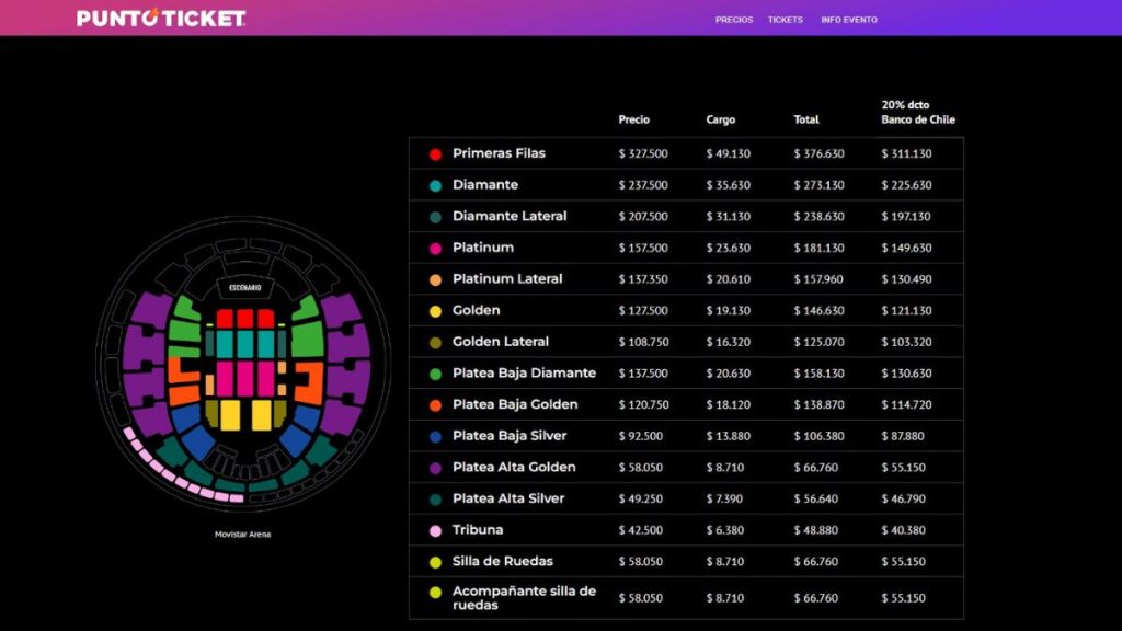 Las entradas las puedes comprar a través de PuntoTicket, registrándote en la web. Y ojo, que si no eres Banco de Chile, la venta de tickets generales se activa inmediatamente una vez que termina la promoción de la entidad financiera.