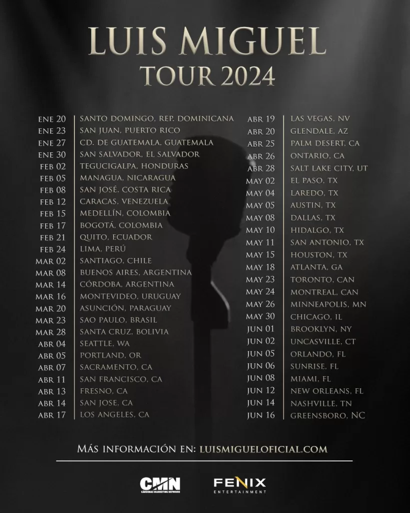 Según el post que realizó en su cuenta oficial de Instagram, Luis Miguel recorrerá varios países, entre ellos: Colombia, Perú, Bolivia, Estados Unidos, Canadá, Puerto Rico, Guatemala, Brasil, Ecuador, Nicaragua, Honduras, Costa Rica, entre otros. Y nueva fecha para Chile corresponde al 02 de marzo.