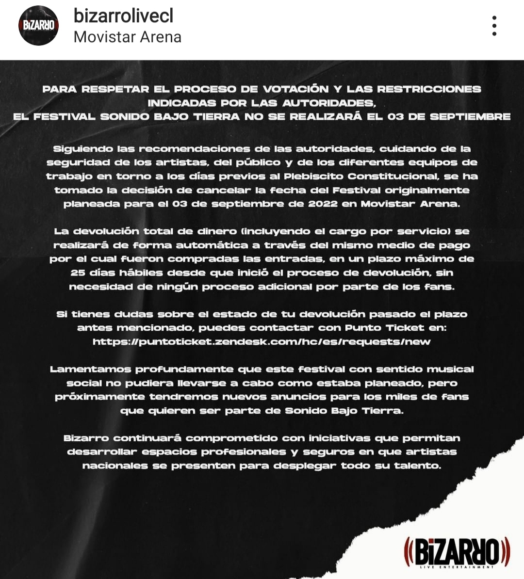 "Para respetar el proceso de votación y las restricciones indicadas por las autoridades, el Festival Sonido Bajo Tierra no se realizará el 3 de septiembre", comenzó relatando la productora.
