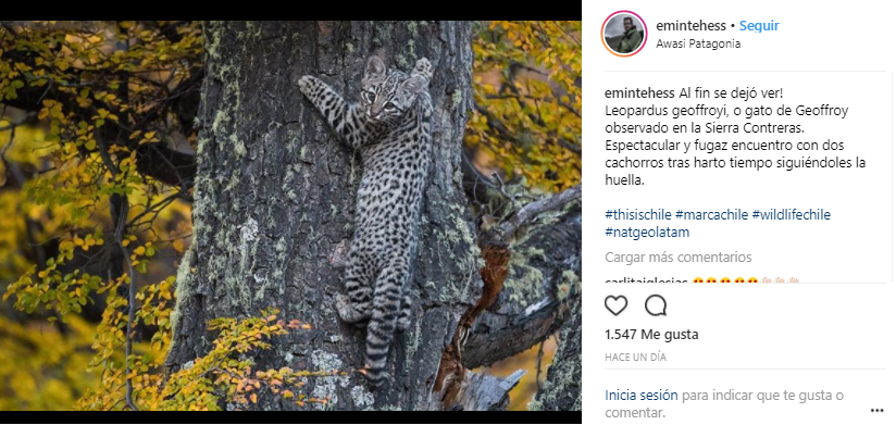 En una entrevista con Ladera Sur, el fotógrafo Eduardo Mintes contó cómo logró encontrar al gato de Geoffroy: "Me encontraba buscando pumas con un colega en la reserva del Hotel Awasi (Torres del Paine), cuando vi que las nubes estaban bonitas sobre las montañas y el cielo al Este, estaba despejando. Esto presagiaba un lindo amanecer, así que manejé un poco más hasta ubicarme en un mirador con un poco más de altura. Empezó el show del amanecer, saqué mis fotos y me senté a disfrutar del paisaje. Tras un par de minutos escuché a unos rayaditos, que empezaron a vocalizar muy alterados en el bosque a mi lado. Empecé a caminar entre las lengas y tras andar unos 50 metros nos sorprendimos mutuamente con unos gatos geoffroy".