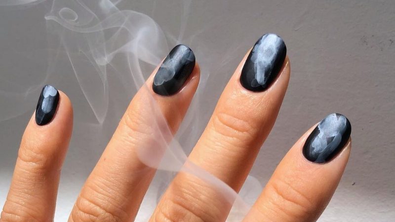 3- Con un pincel, aplica el tono blanco del humo mojando de vez en cuando en agua el pincel para que pierda pigmento y deje algo de agua en la uña creando el efecto humo.