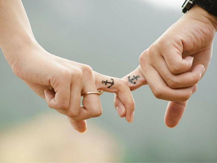 - Tatuajes: Un tatuaje pequeño y delicado puede ser el elemento perfecto para simbolizar el amor y llevarlo grabado en la piel por el resto de la vida. Pueden tatuarse en el mismo dedo anular (donde iría la alianza) distintos motivos como el símbolo del infinito, la inicial del nombre del otro, un ancla, un corazón e, incluso, una línea fina o más gruesa simulando un anillo. También pueden tatuarse detrás de la oreja, en la nuca o en las muñecas.