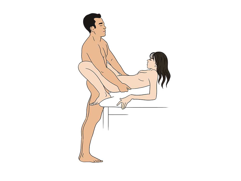 Esta posición funciona en una mesa, sillón, cama lo que sea que haga que tu recostada este a la altura de la entrepierna de tu pareja, que puede penetrarte de pie. Recostada en una plataforma los dejará en el mismo nivel para tener sexo, además de poder mantener el contacto visual.