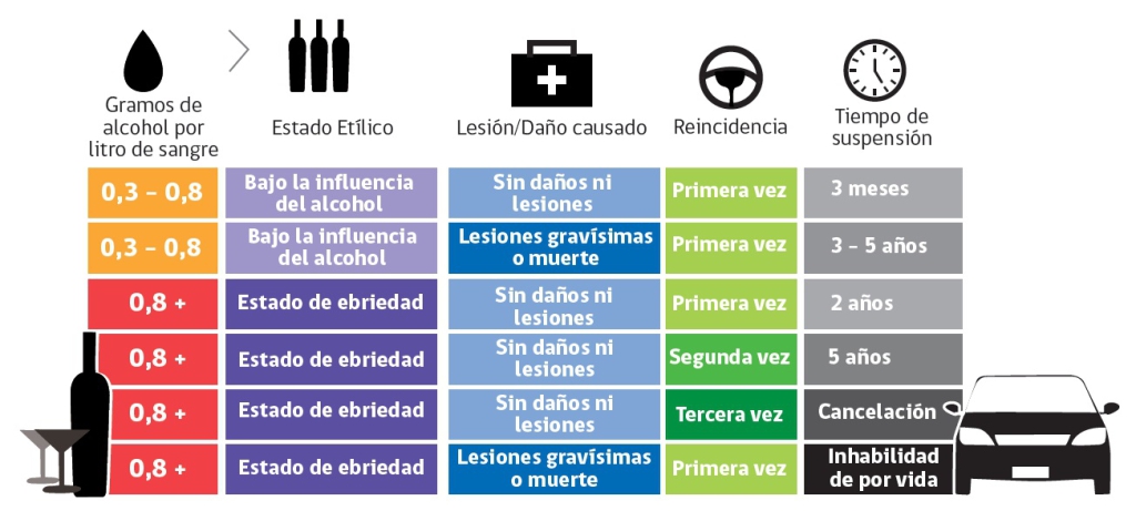 De acuerdo a nuestra legislación, "bajo la influencia del alcohol" corresponde a cuando el índice de alcohol en la sangre es superior a 0,3 y menor a 0,8 por mil, mientras que en "estado de ebriedad" se refiere a cuando el índice de alcohol en la sangre es igual o superior a 0,8 gramos por mil.