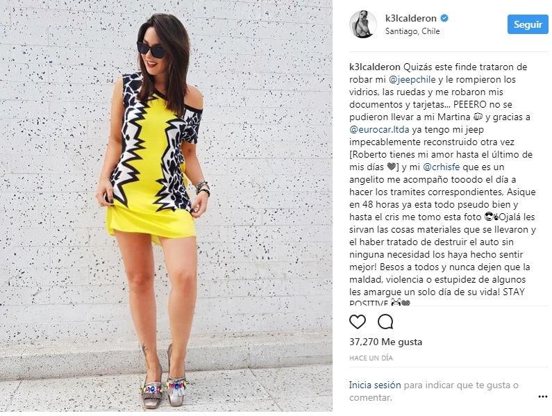"Quizás este finde trataron de robar mi @jeepchile y le rompieron los vidrios, las ruedas y me robaron mis documentos y tarjetas", parte diciendo Kel en una publicación que compartió a través de su cuenta de Instagram donde publicó una foto de ella misma para reflejar que no se dejaría afectar por el grave problema que sufrió.