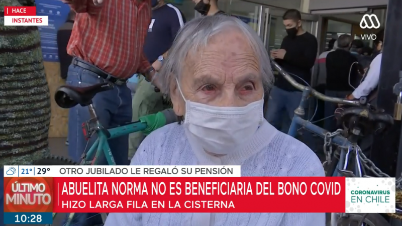 Lamentablemente, ella no calificaba para el bono y su pensión la iban a entregar más tarde, por lo que no tenía dinero. Y en ese momento, aparece un hombre en bicicleta, que le paso 100 mil pesos de su propia pensión. Él solo se fue, emocionando a todos el panel ante su gesto.