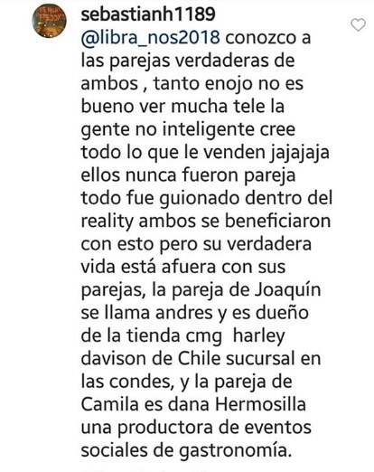 Todo esta polémica hizo relucir algunos comentarios que le dejaba el acosador a Camila, sobretodo uno donde los acusó a ambos de ser pololos en pantalla, ya que ambos tendrían sus parejas verdaderas afuera: él con un hombre y ella con otra mujer.