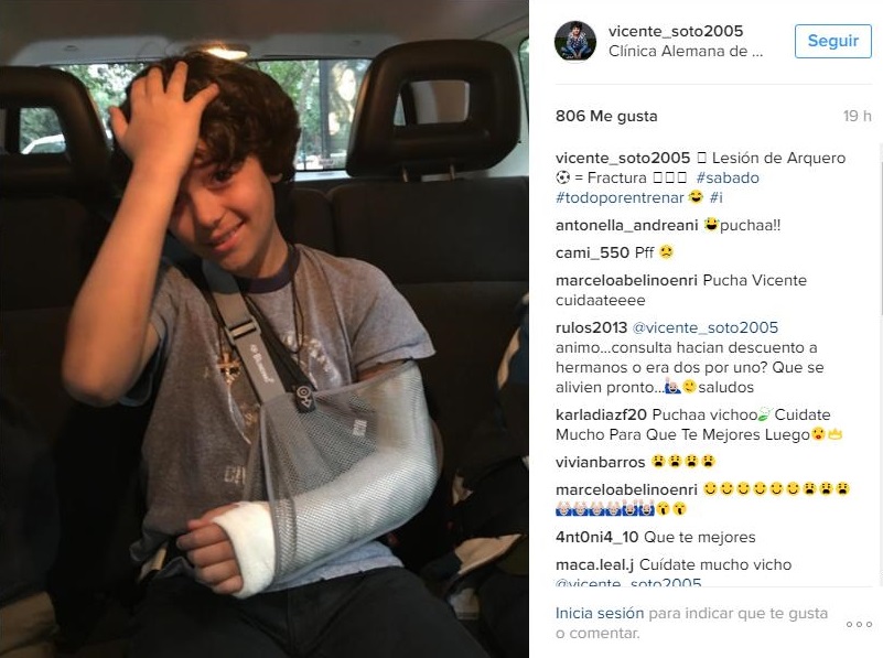 Y es que en la imagen el niño informa que sufrió una lesión por jugar fútbol, generando inmediatas muestras de cariños de parte de sus cientos de seguidores.