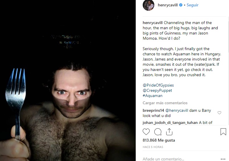 El mensaje que acompaña la foto era el siguiente: "Canalizando al hombre del momento, el hombre de grandes abrazos, grandes risas y grandes pintas de Guinness, mi hombre Jason Momoa. ¿Cómo me veo?. Hablando en serio, finalmente tuve la oportunidad de ver a Aquaman aquí en Hungría. Jason, James y todos los involucrados en esa película, la sacan del parque. Si aún no lo has visto, vayan a verla. Jason, te amo hermano, lo aplastaste".