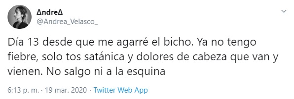 Además la actriz se encargó de dar algunas recomendaciones en caso de sospecha de Covid-19. "Si te sientes un poco mal, fiebre o mucha tos y NO ERES DE GRUPO DE MAYOR RIESGO, quédate en cama, paracetamol, jarabe para la tos y aislado de otros", señaló en otro tuit.