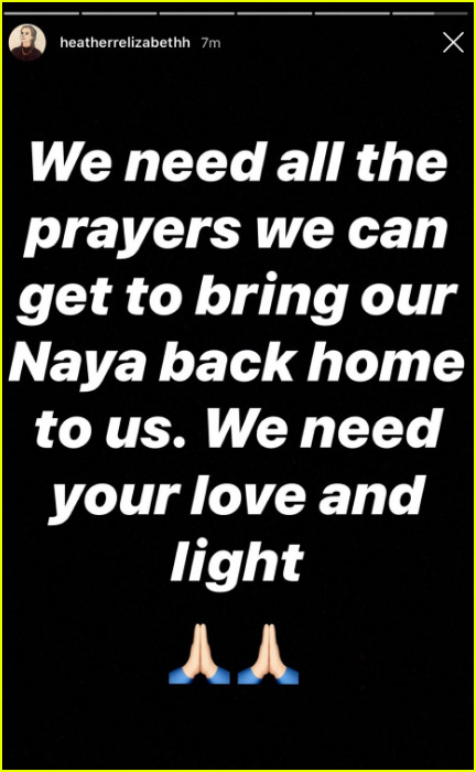 Además a través de sus respectivas redes sociales diversos exmiembros de "Glee" han pedido oraciones por Naya. Tal fue el caso de Heather Morris, quien interpretó a Brittany, la novia de Rivera en la ficción. "Necesitamos todas las oraciones que podamos conseguir para traer a Naya a casa con nosotros. Necesitamos su amor y luz", escribió en sus stories.