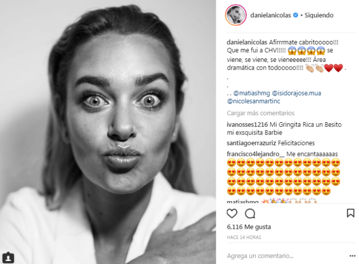 A través de su cuenta de Instagram, Daniela confirmó la noticia expresando todo su entusiasmo. "¡Afírmate cabrito, que me fui a CHV!, ¡se viene, se viene, se viene! Área dramática con todo", escribió la artista.