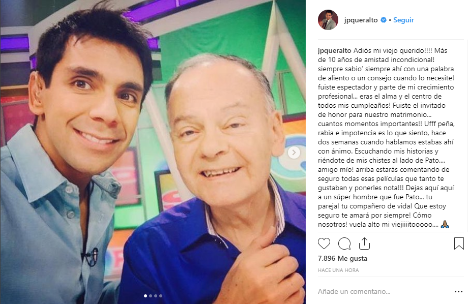 Además dio a conocer que mantenía el contacto con él hasta el final. De hecho, fue uno de los invitados de honor a su matrimonio. "Fuiste el invitado de honor para nuestro matrimonio... cuantos momentos importantes!! Ufff peña, rabia e impotencia es lo que siento, hace dos semanas cuando hablamos estabas ahí con ánimo. Escuchando mis historias y riéndote de mis chistes al lado de Pato", lamentó Queraltó.