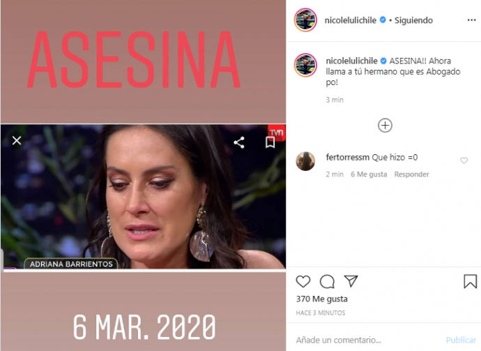 En medio de esto, Nicole acusó directamente a la modelo Adirana Barrientos de hacerle bullying y publicó una serie de fotografías de 'la Leona', donde escribió: «¡¡ASESINA!! ¡Ahora llama a tu hermano que es abogado po!».