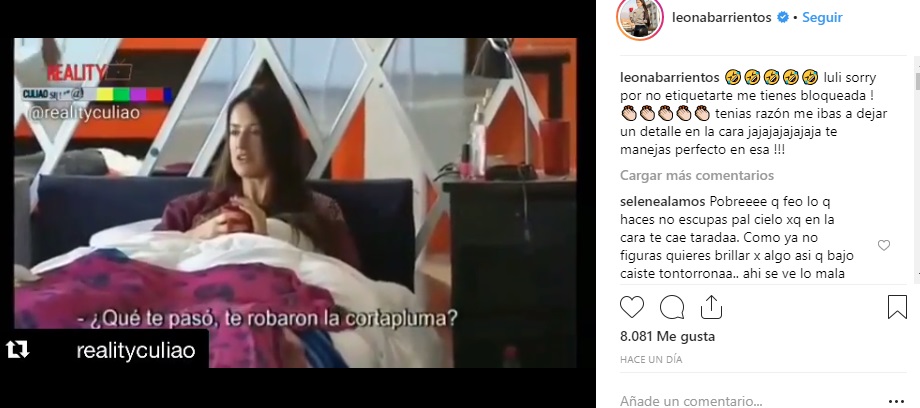 La 'Leona' usó su cuenta de Instagram para subir un video donde se le ve a ella y a la ex Reina de Viña en una pelea que tuvieron en el reality show "Amor a prueba", compartiendo la publicación con el siguiente mensaje: “Luli, sorry por no etiquetarte me tienes bloqueada. Tenías razón, me ibas a dejar un detalle en la cara jajajajajajaja, te manejas perfecto en esa”.