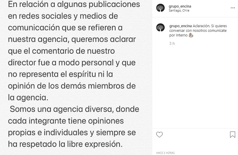 Esta vez, fue la agencia la que entregó una respuesta a todo lo sucedido con Kel Calderón. Fue justamente a través de sus redes sociales, que señalaron: “En relación a algunas publicaciones en redes sociales y medios de comunicación que se refieren a nuestra agencia, queremos aclarar que el comentario de nuestro director fue a modo personal y que no representa el espíritu ni la opinión de los demás miembros de la agencia”.