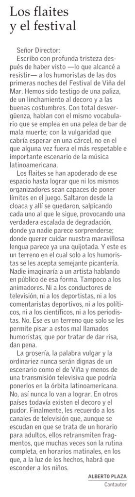 A través de una extensa carta publicada en el diario El Mercurio, el intérprete expresó que los flaites se apoderaron del Festival y criticó los garabatos y chistes de tono sexual de algunas rutinas que hemos visto en la Quinta Vergara. En la columna, el autor de "Que cante la vida" enfatizó: "Hemos sido testigo de una paliza, de un linchamiento al decoro y a las buenas costumbres. Con total desvergüenza, hablan con el mismo vocabulario que se emplea en una pelea de bar de mala muerte; con la vulgaridad que cabría esperar en una cárcel, no en el que alguna vez fuera el más respetable e importante escenario de la música latinoamericana".