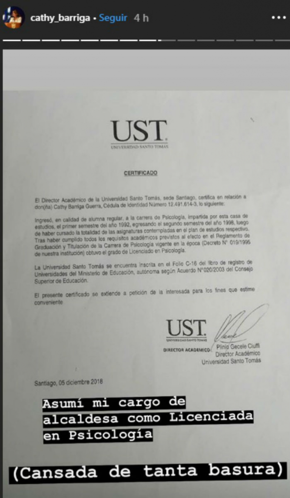 Pero tan pronto como salieron los periodistas en pantalla, la alcaldesa se descargó en su cuenta de Instagram. “Asumí mi cargo de alcaldesa como Licenciada en Psicología”, escribió. En la misma historia de Instagram, aseguró estar “cansada de tanta basura”.