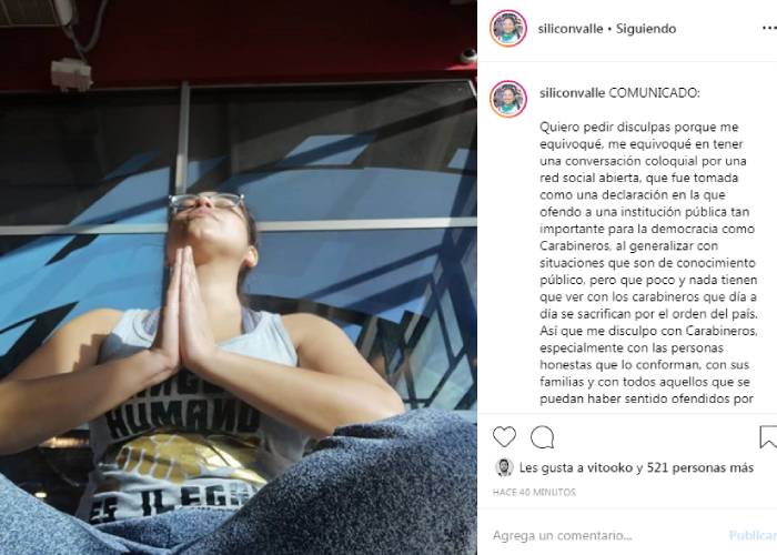 En un principió partió: "Quiero pedir disculpas porque me equivoqué, me equivoqué en tener una conversación coloquial por una red social abierta, que fue tomada como una declaración en la que ofendo a una institución pública tan importante para la democracia como Carabineros, al generalizar con situaciones que son de conocimiento público, pero que poco y nada tienen que ver con los carabineros que día a día se sacrifican por el orden del país".