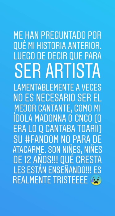 “Luego de decir que para ser artista lamentablemente, a veces, no es necesario ser el mejor cantante, como mi ídola Madonna o CNCO (que era lo que cantaba Toarii) su fandom no para de atacarme ¡Son niños de 12 años! ¡Qué cresta les están enseñando! Es realmente triste”, escribió.