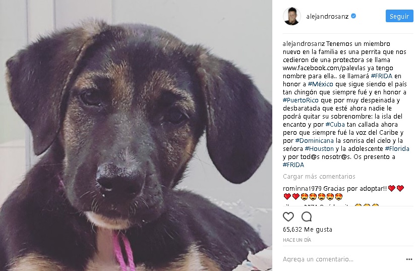 “Tenemos un miembro nuevo en la familia. Es una perrita que nos cedieron de una protectora. Ya tengo nombre para ella. Se llamará Frida en honor a México que sigue siendo el país tan chingón que siempre fue”, escribió el artista para acompañar la imagen que publicó este domingo en su cuenta de Instagram.