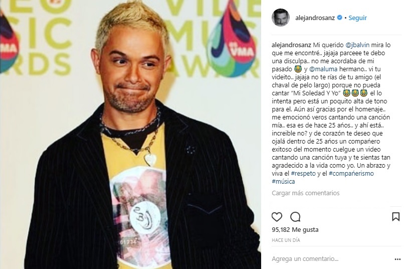 "@maluma hermano.. vi tu videito.. jajaja no te rías de tu amigo (el chaval de pelo largo) porque no pueda cantar “Mi Soledad Y Yo”. Él lo intenta pero está un poquito alta de tono para él. Aún así gracias por el homenaje.. me emocionó verlos cantando una canción mía.. esa es de hace 25 años.. y ahí está.. increíble, no? Y de corazón te deseo que ojalá dentro de 25 años un compañero exitoso del momento cuelgue un video cantando una canción tuya y te sientas tan agradecido a la vida como yo. Un abrazo y viva el respeto y el compañerismo", remató Alejandro Sanz.