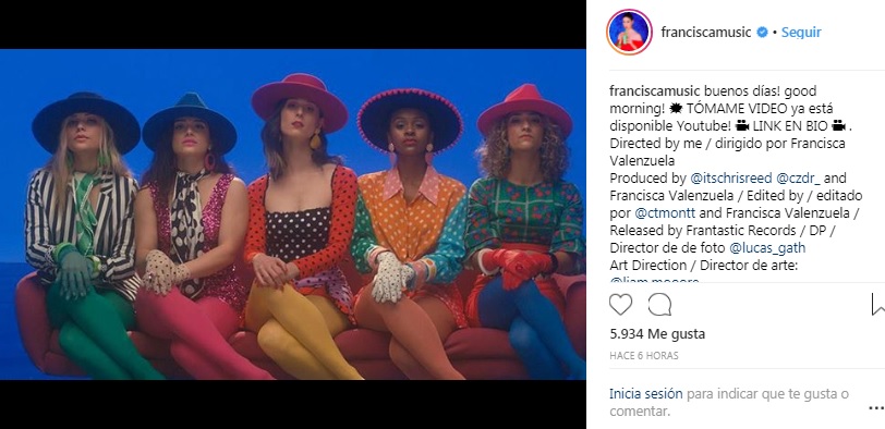 Francisca Valenzuela ha tenido siempre una participación total en el desarrollo y realización de sus videos, pero en el caso de “Tómame” su rol como directora fue más completo al estar en un set junto a un equipo multicultural que le ayudó a materializar su visión. El single “Tómame” se estrenó en las principales plataformas de streaming el viernes 20 de julio y a la fecha acumula más de 130 mil reproducciones, y está incluido en masivos playlists de Spotify como “Chicas Indie”, “Pop Chile” y "New Music Friday Latin".