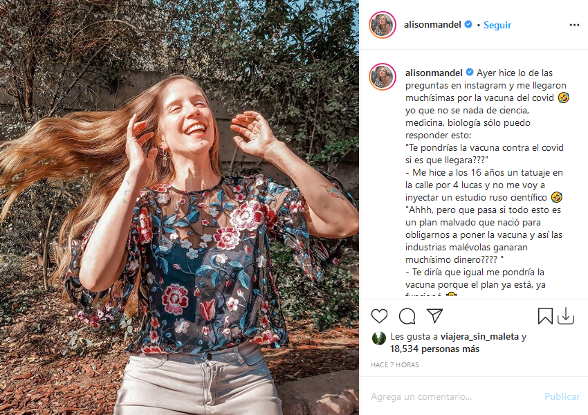 También le preguntaron: ""Ahhh, pero que pasa si todo esto es un plan malvado que nació para obligarnos a poner la vacuna y así las industrias malévolas ganaran muchísimo dinero????", a lo que Alison respondió: "Te diría que igual me pondría la vacuna porque el plan ya está, ya funcionó 🤷🏼♀️".