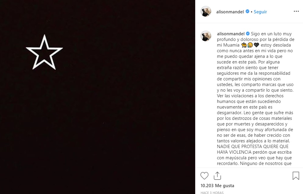 "Sigo en un luto muy profundo y doloroso por la pérdida de mi Muamia. Estoy desolada como nunca antes en mi vida pero no me puedo quedar ajena a lo que sucede en este país", partió señalando en la publicación.