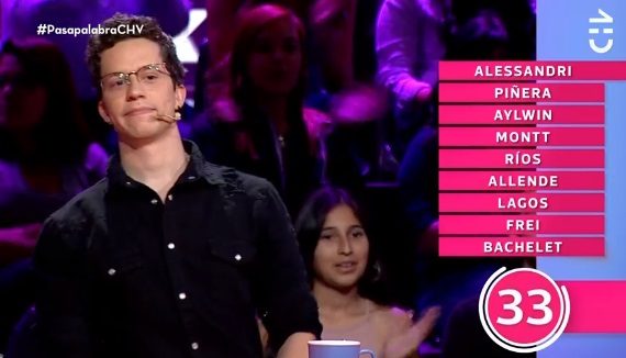 Pero donde se lució increíblemente fue en la prueba de "La memoria", donde decidió recordar apellidos de presidentes de Chile: Bachelet, Frei, Lagos, Allende, Ríos, Montt, Aylwin, Piñera y Alessandri.