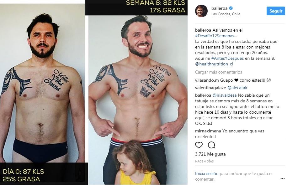 Ballero también aclaró que "La primeras 2 semanas no me salgo de la dieta, así bajé 6 kilos. Desde la semana 3 me salgo 2 VECES a la semana; una con tragos como sour y destilados y otra chanchando todo lo que pueda en 1 SOLA COMIDA. Cuando consumes alcohol tu organismo sólo se concentrará en eliminar el alcohol de la sangre, por ende el metabolismo baja, entonces todo lo que comas se irá a la panza, si vas a tomar come MUY SANO ese día y haaaarta agua. 3 veces por semana me permito comer chocolate (70% cacao) y 2 copas de vino tinto o champaña."