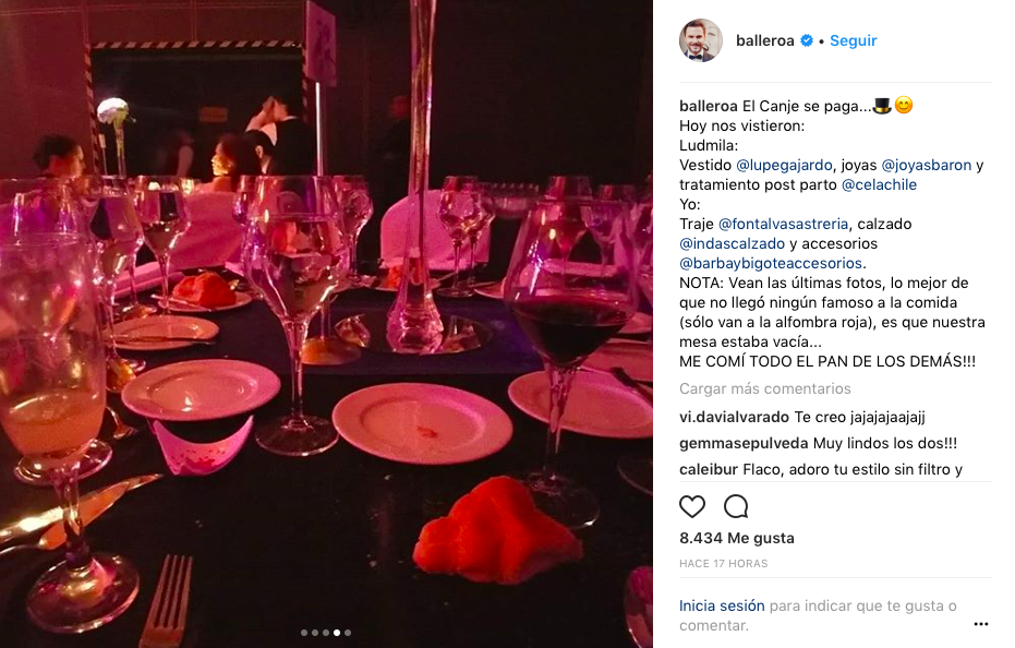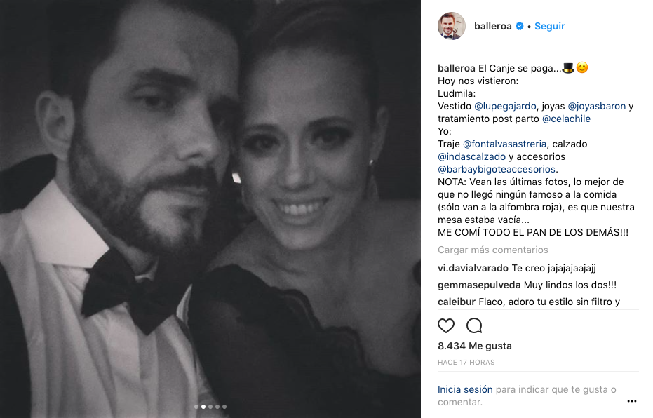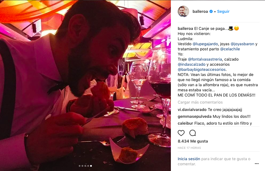 Por esa misma razón, Ballero aprovechó de disfrutar lo que había: "nuestra mesa estaba vacía. Me comí todo el pan de los demás", confesó el galán quien estuvo acompañado de su esposa Ludmila.