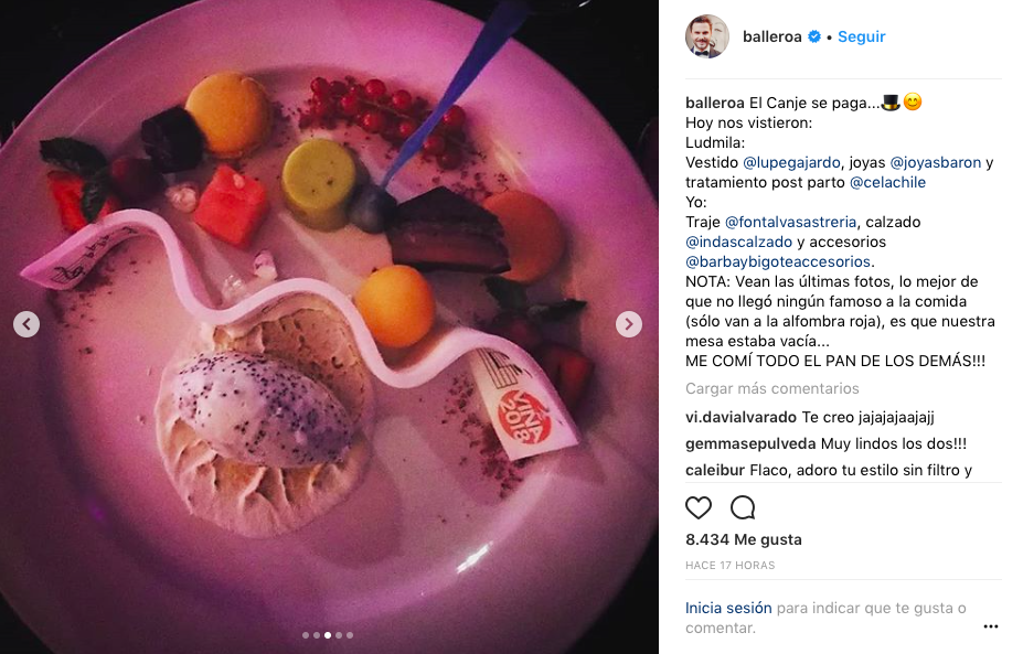 Según contó en su cuenta de Instagram y donde publicó una serie de imágenes de la cena, "no llegó ningún famoso a la comida (sólo van a la alfombra roja)".