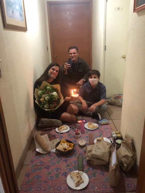 "¡Cuidando a la madre! Sorpresa de feliz cumpleaños haciendo picnic en el pasillo del edificio para honrar su aislamiento", escribió el conductor de "Bienvenidos" en Twitter. El periodista acompañó la publicación con unas fotos del momento, donde se le ve junto a su familia sentados en el suelo.