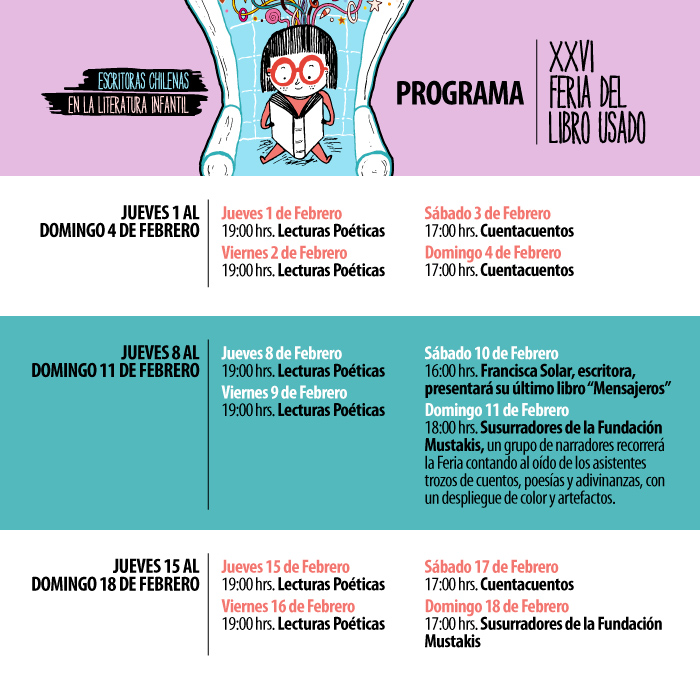 Por lo mismo, no se pueden perder la Feria del Libro Usado en la Universidad Mayor, que estará hasta el 18 de febrero y este año destaca a autoras chilenas en la literatura infantil, quienes se caracterizan por crear grandes historias para niños y relatos que han traspasado diversas generaciones.