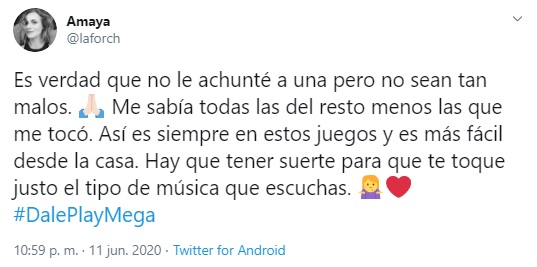 "Es verdad que no le achunté a una pero no sean tan malos. Me sabía todas las del resto menos las que me tocó. Hay que tener suerte para que te toque justo el tipo de música que escuchas", comentó la también cantante en un tuit.