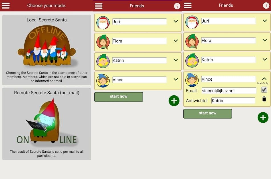 Otra alternativa gratuita para organizar el amigo secreto es “Secret Santa app”. Solo necesitas ingresar a la app, sin necesidad de registrarte. La aplicación cuenta con dos mecanismos de sorteo: presencial y online. Y los resultados del sorteo serán recibidos por correo.