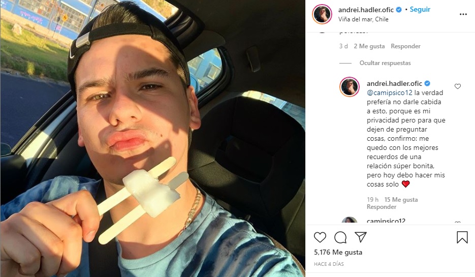 En el último tiempo comenzaron las especulaciones sobre un quiebre entre Andrei y Hernán, pues ya no subían fotos juntos en Instagram. En ese contexto, Hadler terminó por confirmar lo que se venía rumoreando: efectivamente ya no están juntos.